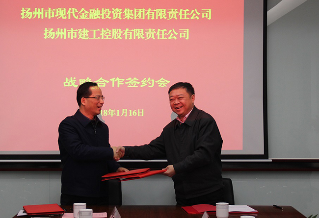 1月16日下午,揚州建工控股有限責任公司與揚州市現(xiàn)代金融投資集團有限責任公司(下稱“金融集團”)舉行戰(zhàn)略合作簽約會。公司董事長王宏、副總經(jīng)理程杰,金融集團董事長龔振志、總經(jīng)理劉研等出席簽約會。